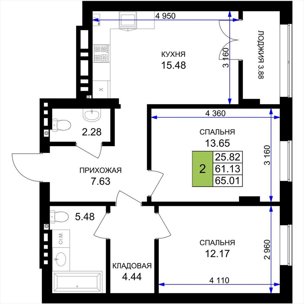 общая 65,01 м2, жилая 25,82 м2, кухни 15,48 м2 |