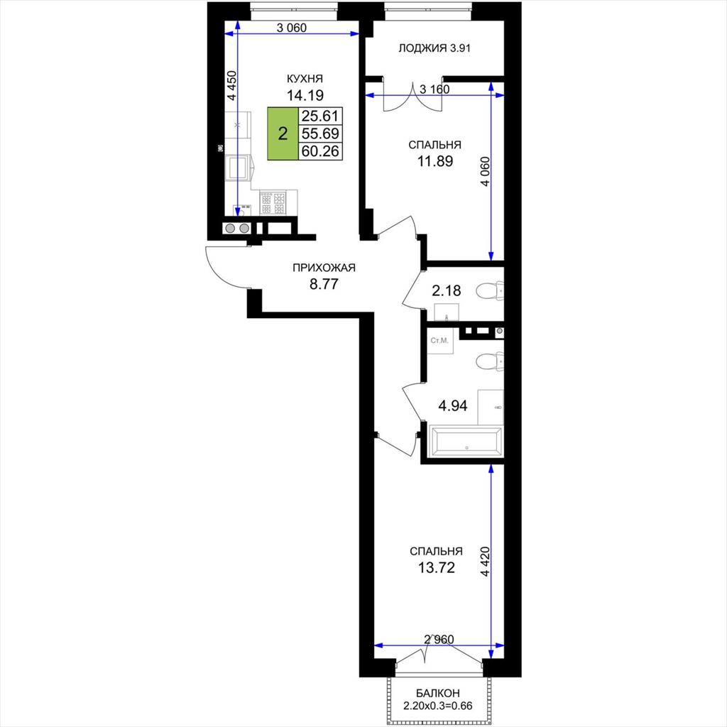 общая 60,26 м2, жилая 25,61 м2, кухни 14,19 м2 |