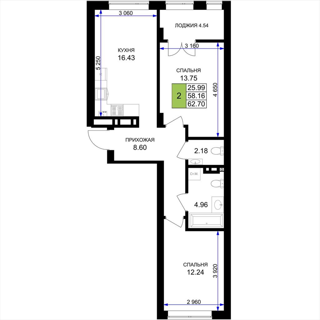общая 62,7 м2, жилая 25,99 м2, кухни 16,43 м2 |