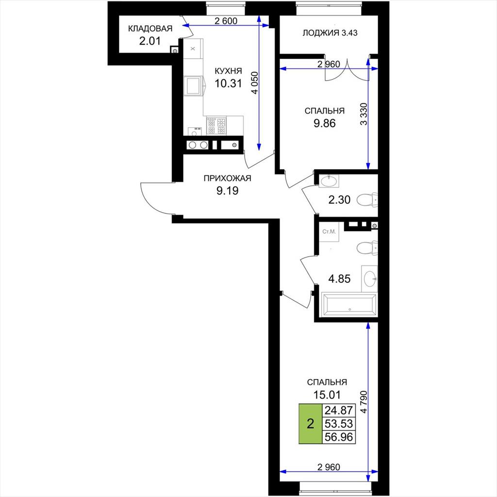 общая 56,96 м2, жилая 24,87 м2, кухни 10,31 м2 |