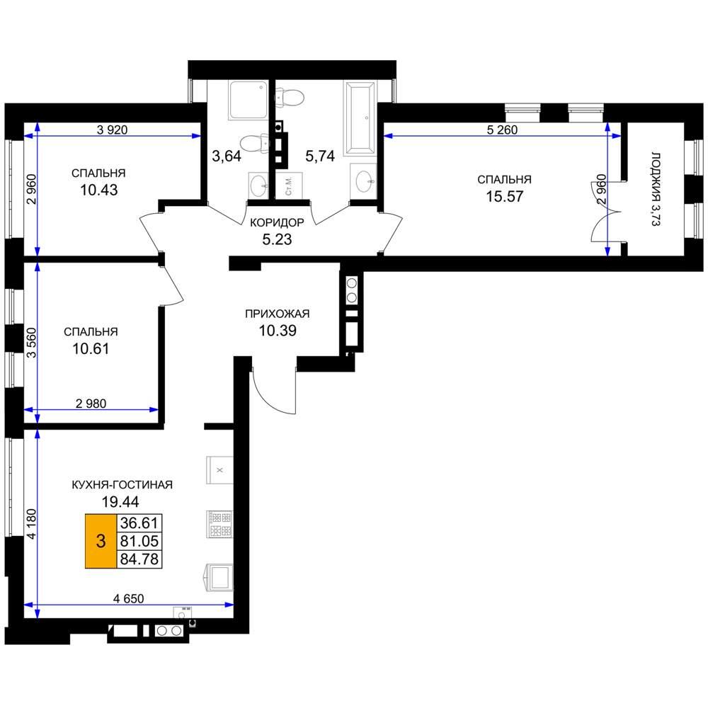 общая 84,78 м2, жилая 36,61 м2, кухни 19,44 м2 |