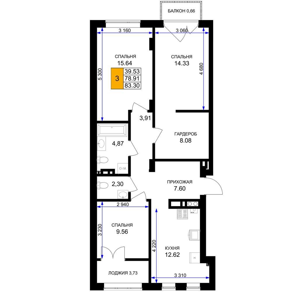 общая 83,3 м2, жилая 39,53 м2, кухни 12,62 м2 |