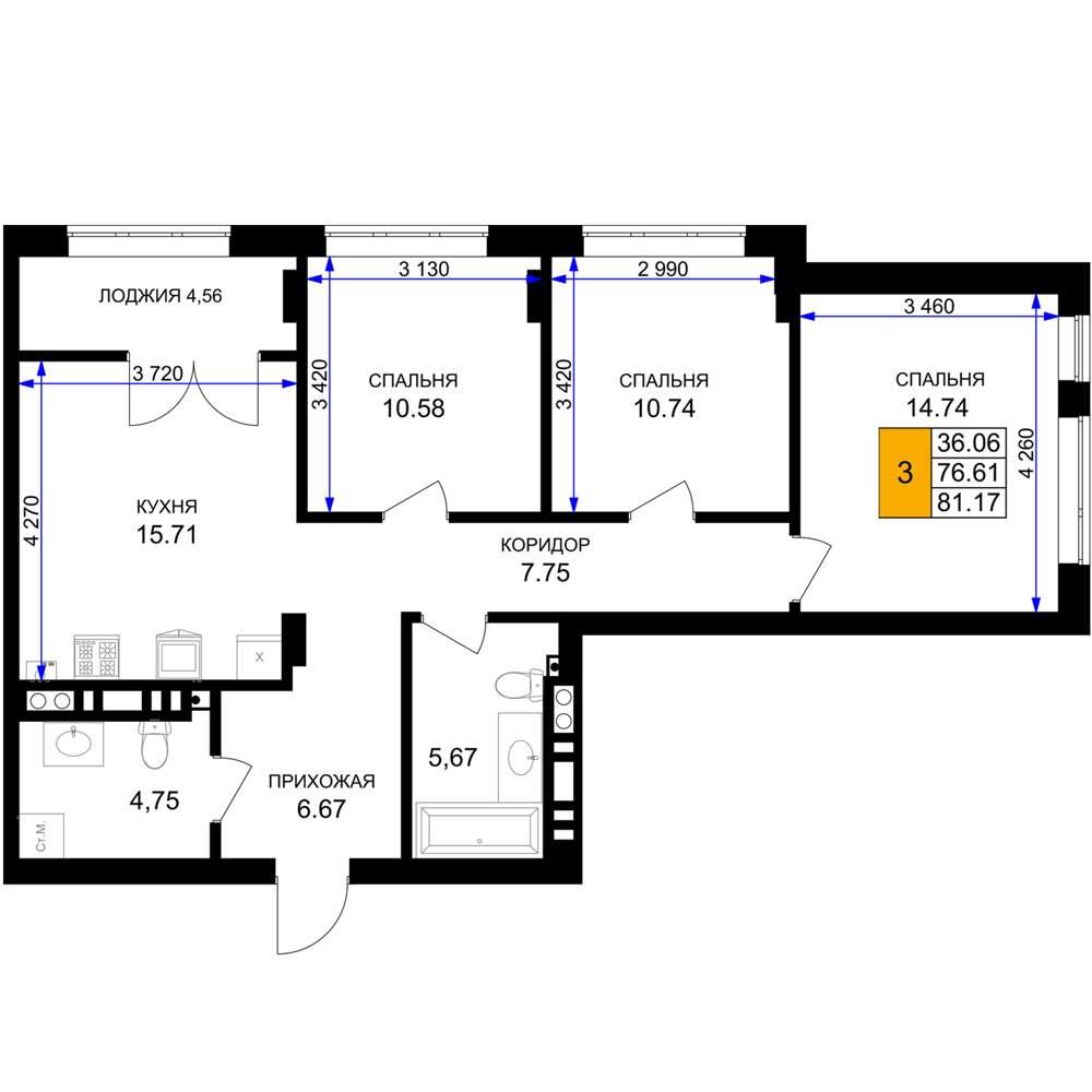 общая 81,17 м2, жилая 36,06 м2, кухни 15,71 м2 |