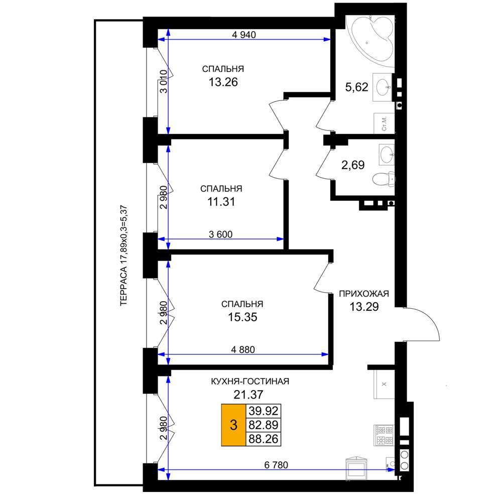 общая 88,26 м2, жилая 39,92 м2, кухни 21,37 м2 |
