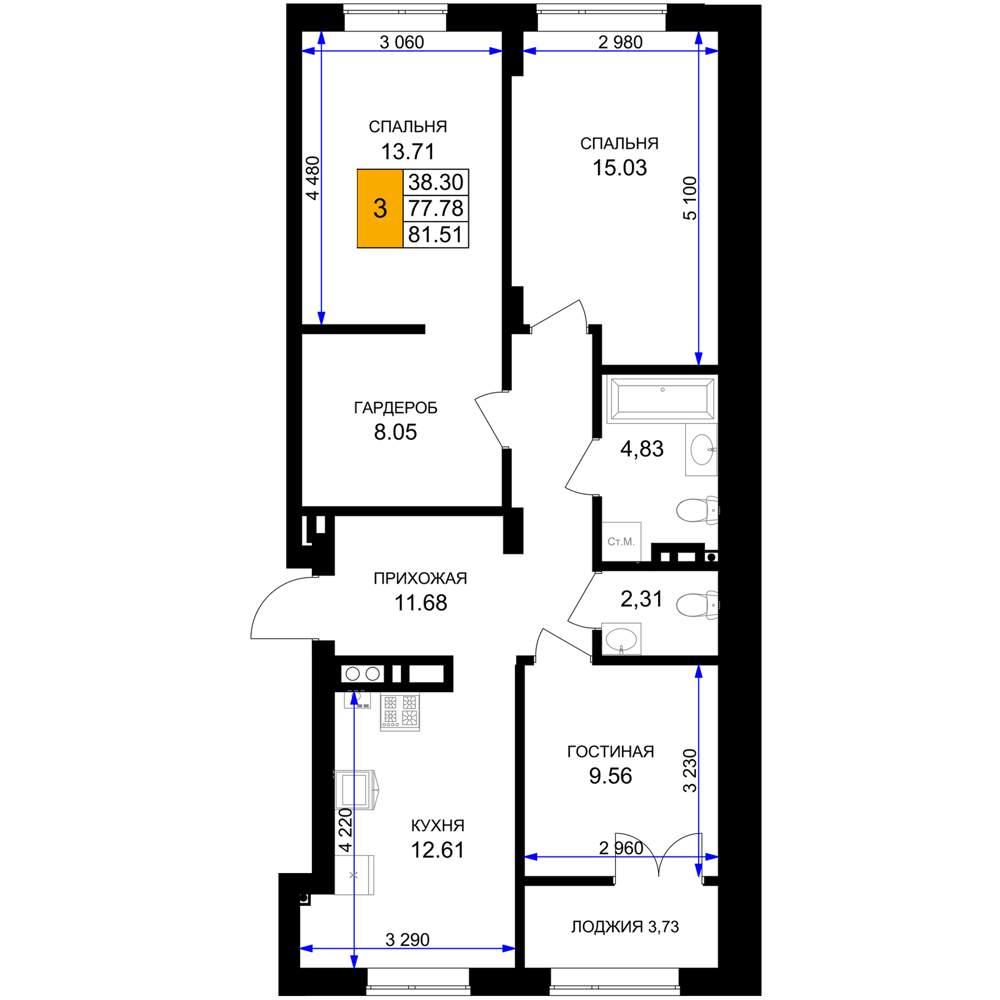 общая 81,51 м2, жилая 38,3 м2, кухни 12,61 м2 |
