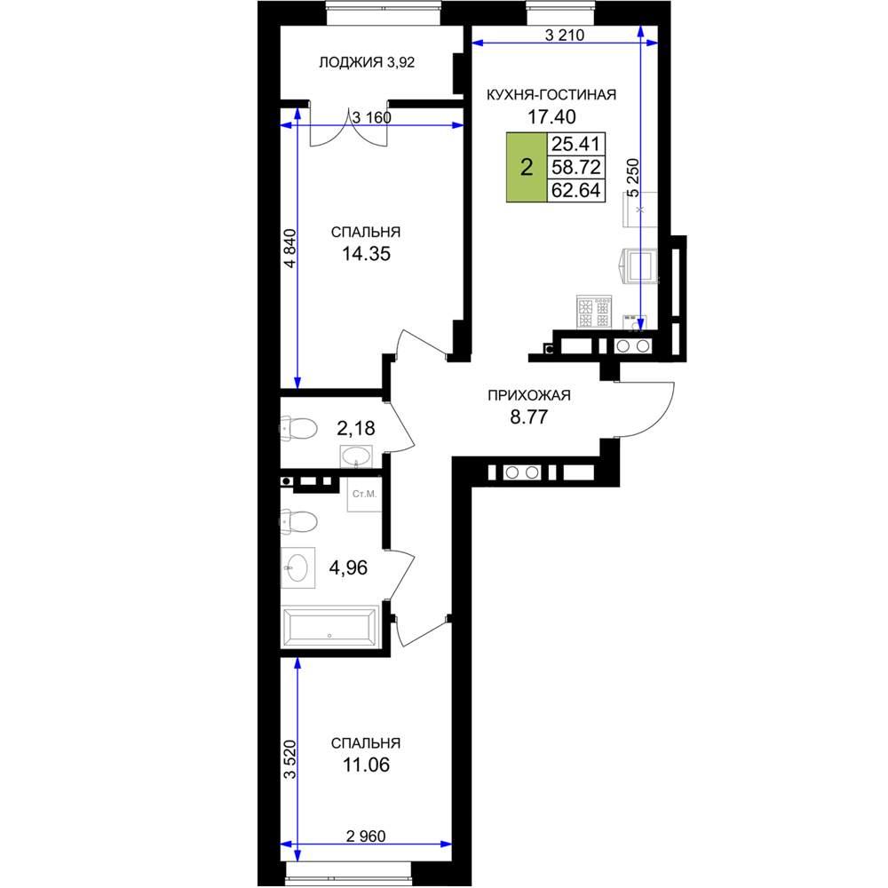 общая 62,64 м2, жилая 25,41 м2, кухни 17,4 м2 |