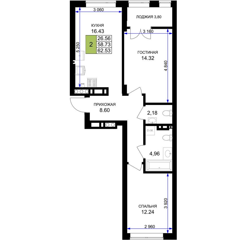 общая 62,53 м2, жилая 26,56 м2, кухни 16,43 м2 |