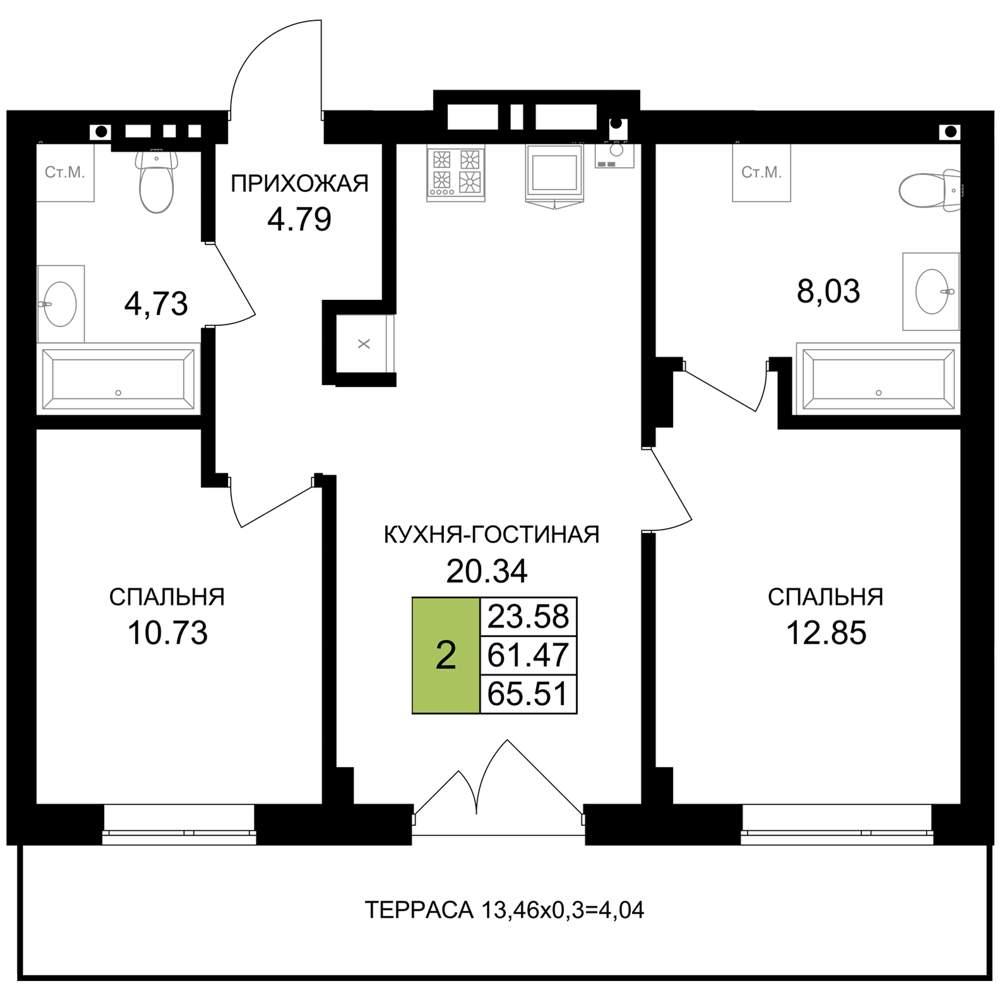 общая 65,51 м2, жилая 23,58 м2, кухни 20,34 м2 |