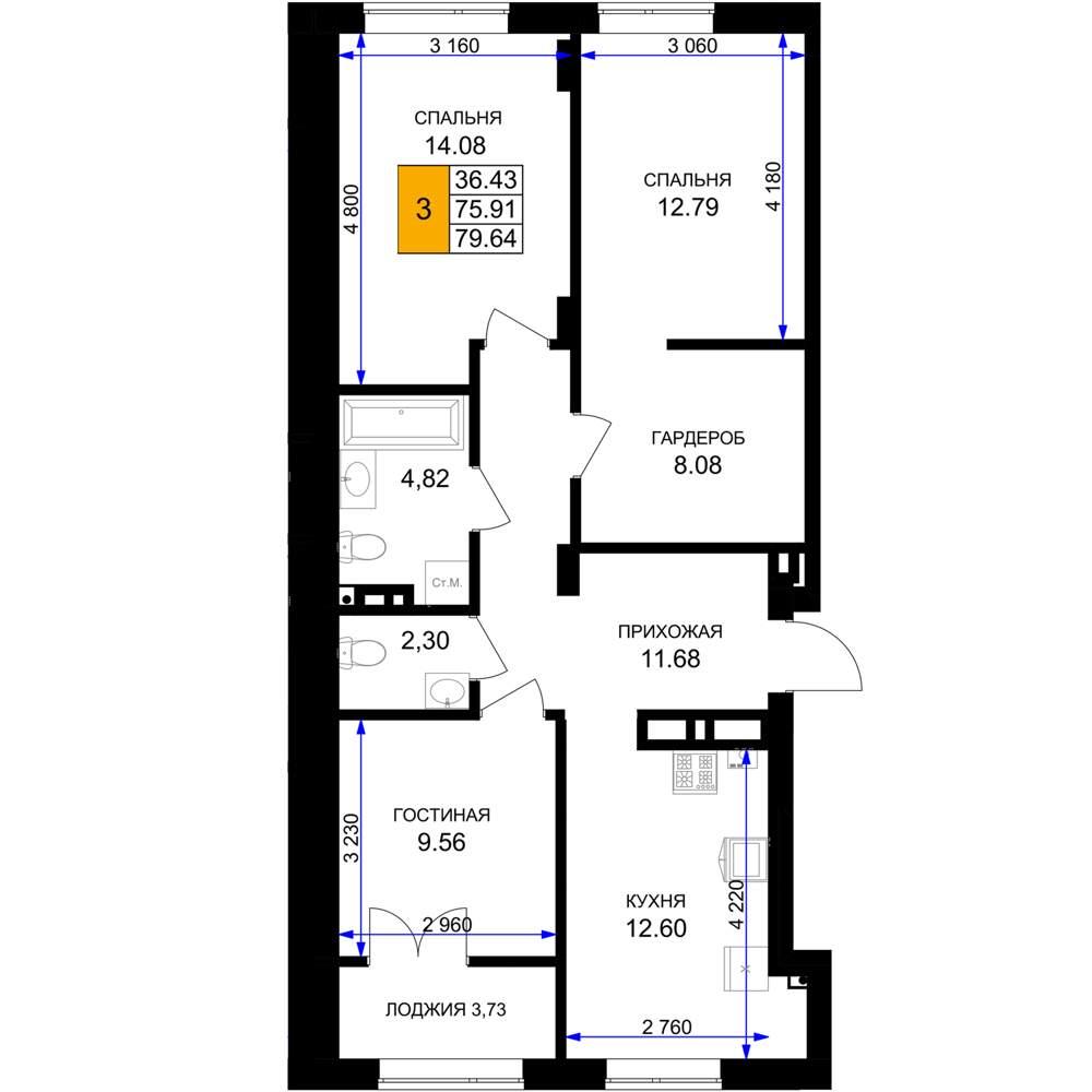 общая 79,64 м2, жилая 36,43 м2, кухни 12,6 м2 |