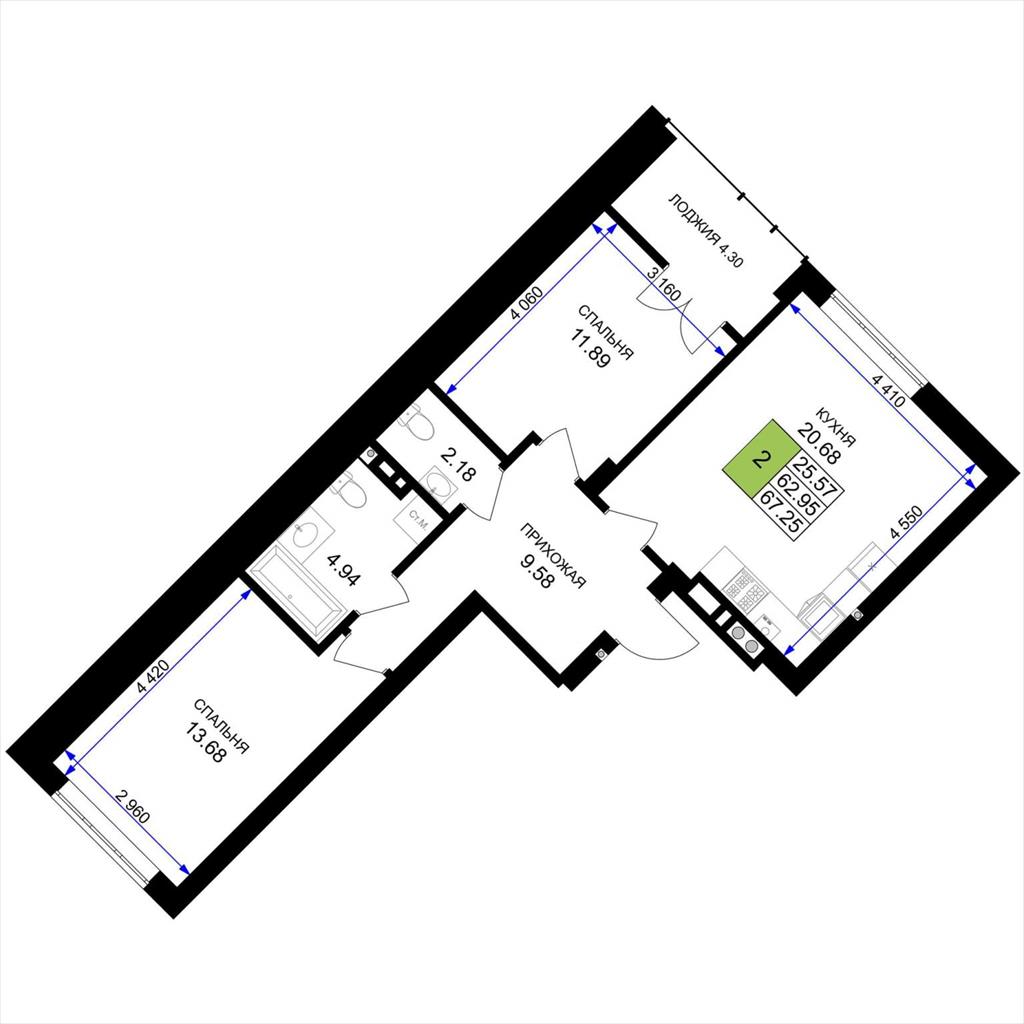 общая 67,25 м2, жилая 25,57 м2, кухни 20,68 м2 |
