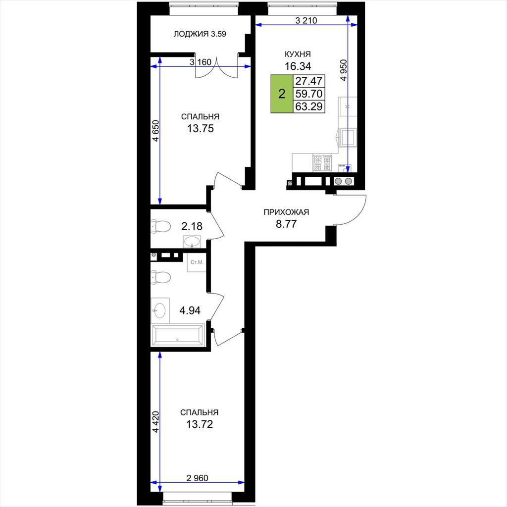 общая 63,29 м2, жилая 27,47 м2, кухни 16,34 м2 |