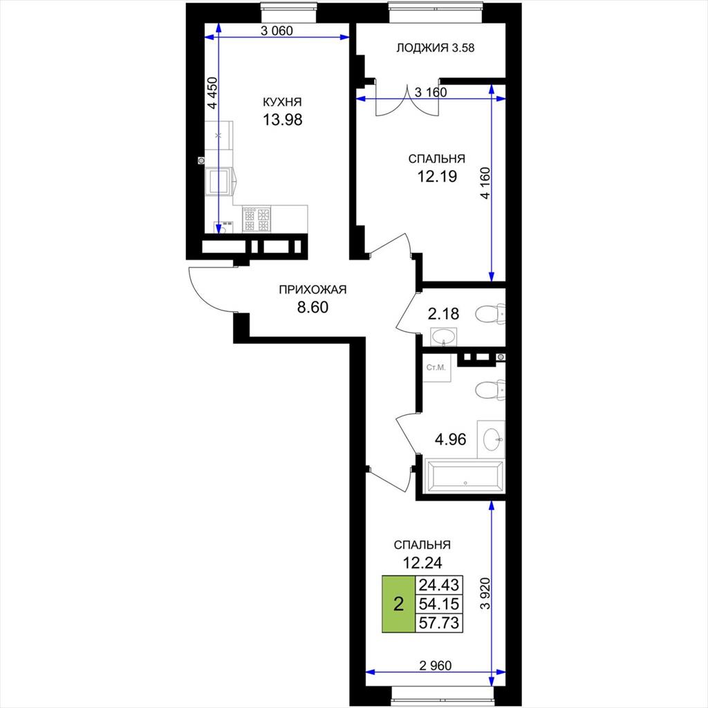 общая 57,73 м2, жилая 24,43 м2, кухни 13,98 м2 |