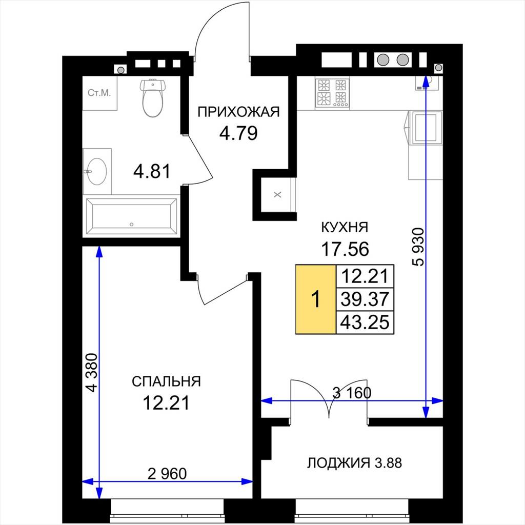 общая 43,25 м2, жилая 12,21 м2, кухни 17,56 м2 |