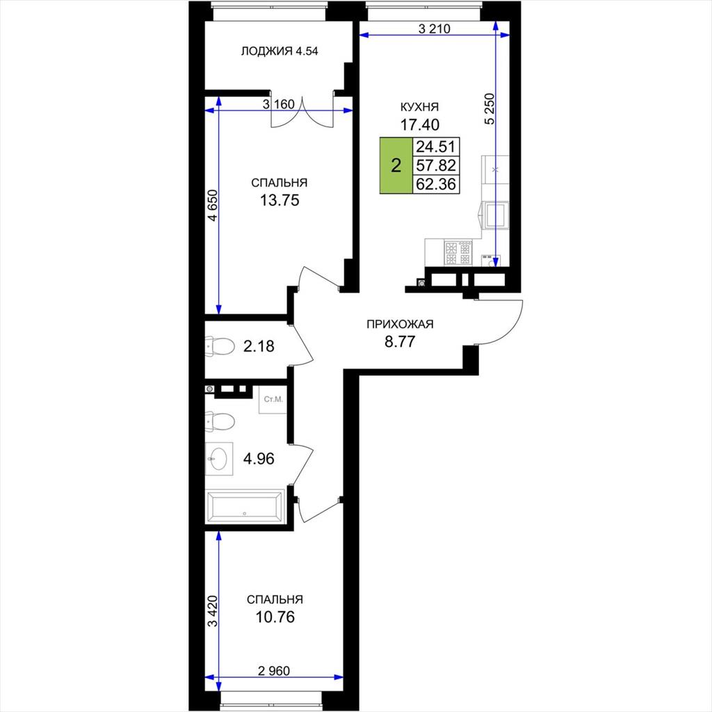 общая 62,36 м2, жилая 24,51 м2, кухни 17,4 м2 |
