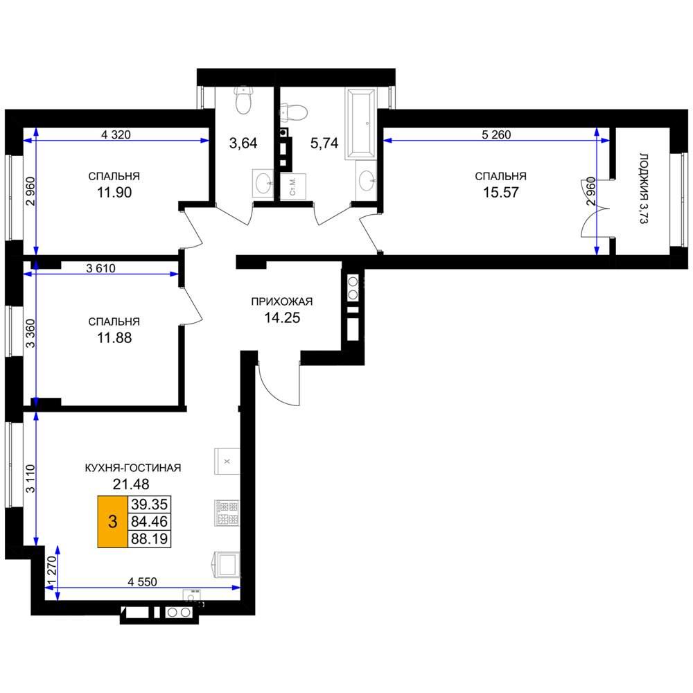общая 88,19 м2, жилая 39,35 м2, кухни 21,48 м2 |