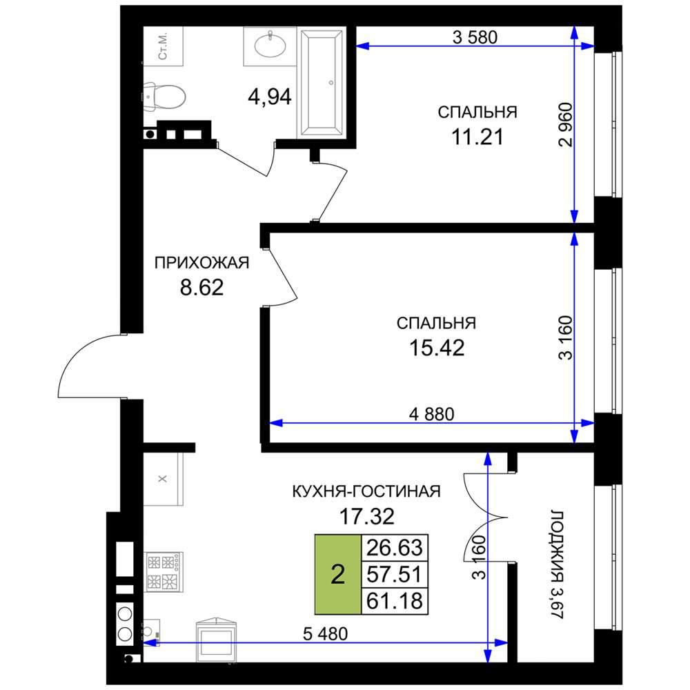 общая 61,18 м2, жилая 26,63 м2, кухни 17,32 м2 |