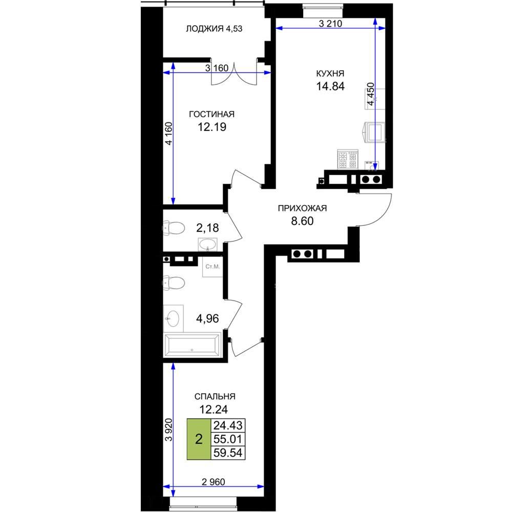 общая 59,54 м2, жилая 24,43 м2, кухни 14,84 м2 |