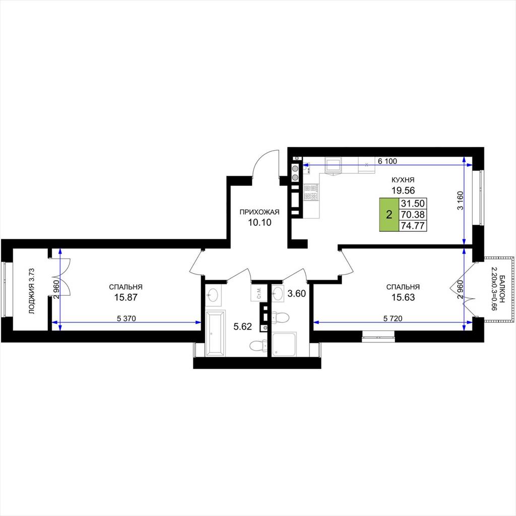 общая 74,77 м2, жилая 31,5 м2, кухни 19,56 м2 |