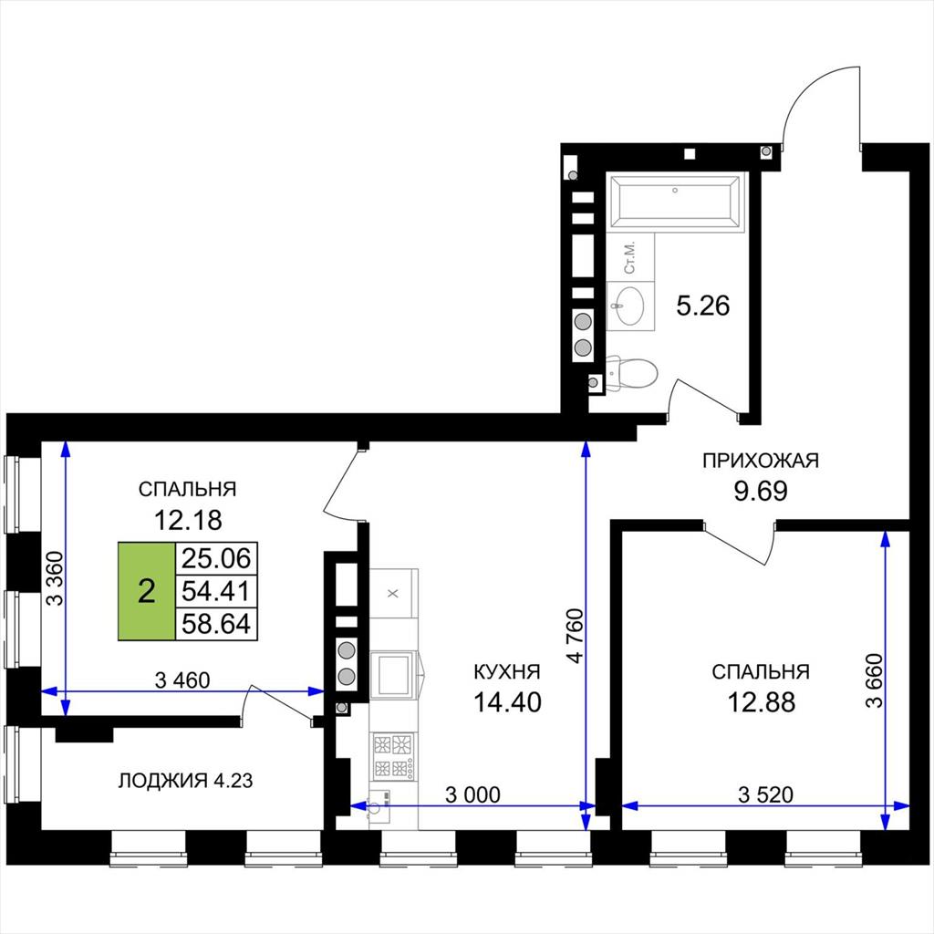 Жилая площадь 25.06 м2, кухня 14.4 м2, предчистовая отделка.
