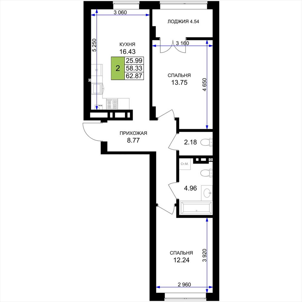 общая 62,87 м2, жилая 25,99 м2, кухни 16,43 м2 |