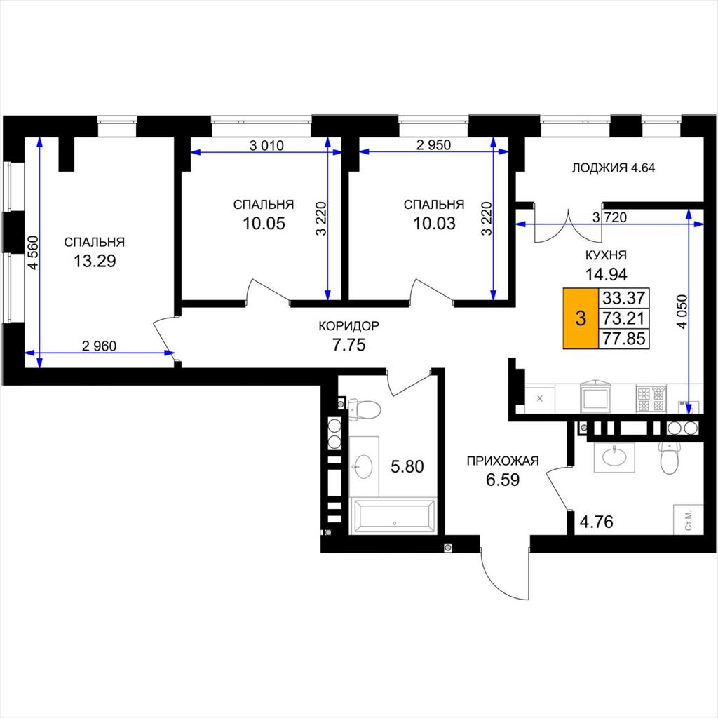 общая 77,85 м2, жилая 33,37 м2, кухни 14,94 м2 |