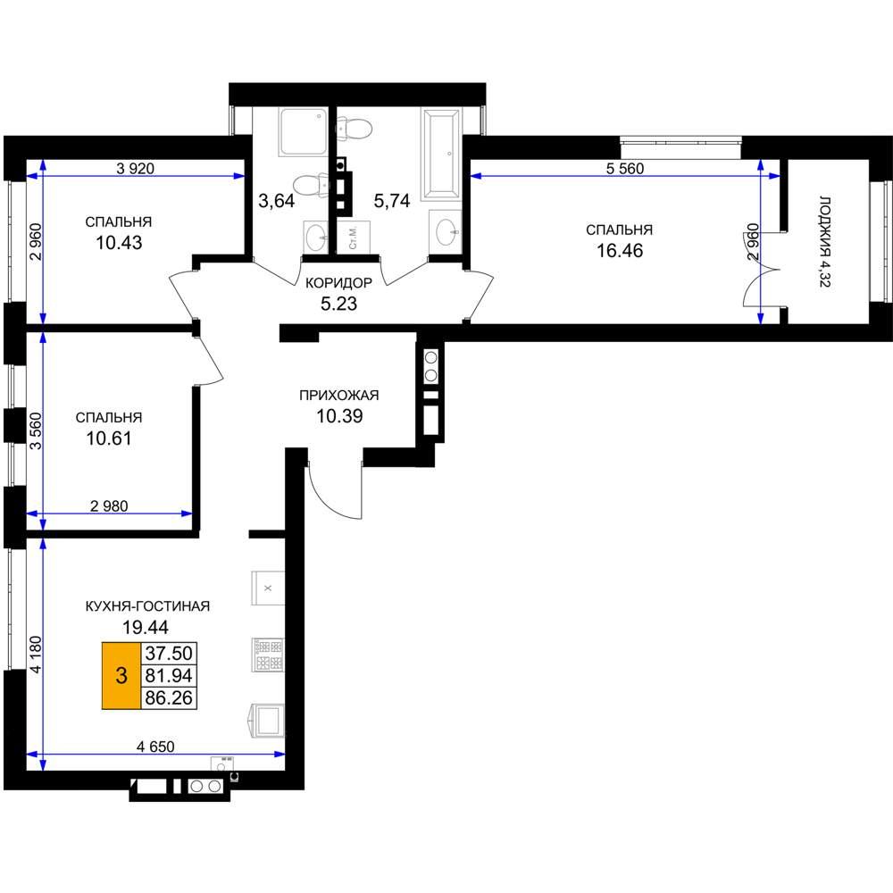 общая 86,26 м2, жилая 37,5 м2, кухни 19,44 м2 |