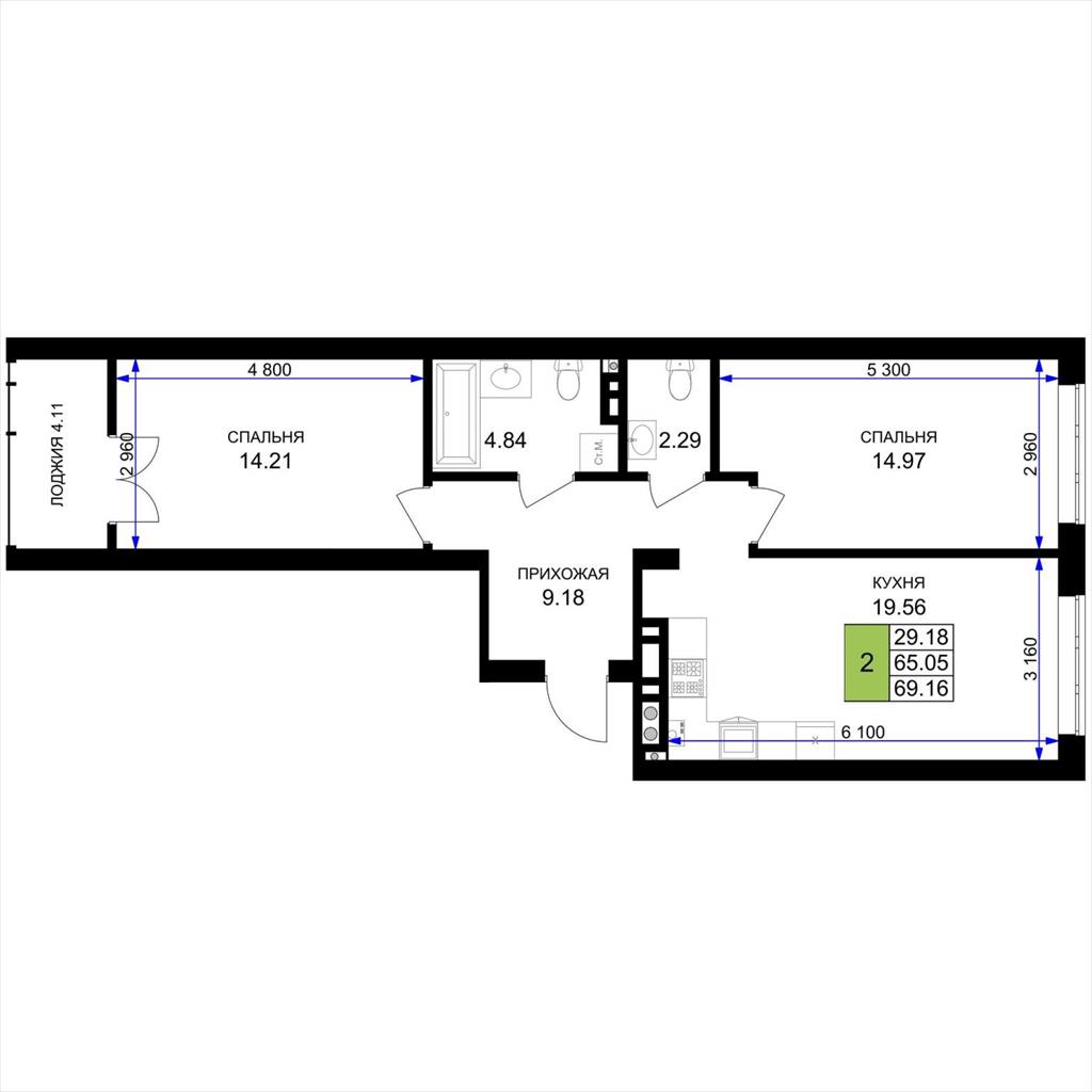 общая 69,16 м2, жилая 29,18 м2, кухни 19,56 м2 |