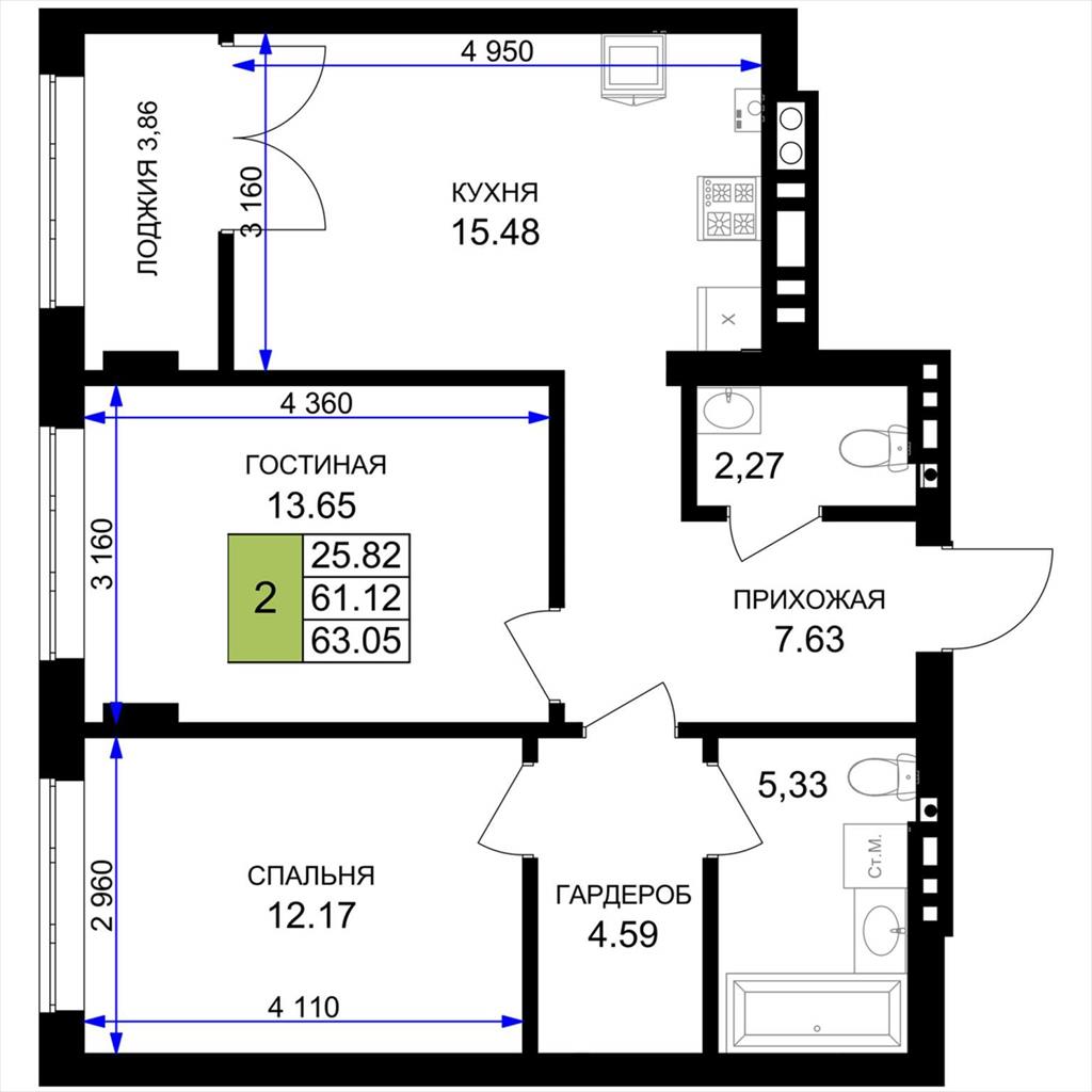 Жилая площадь 25.82 м2, кухня 15.48 м2, предчистовая отделка.