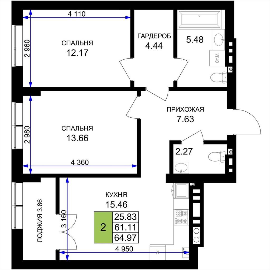 общая 64,97 м2, жилая 25,83 м2, кухни 15,46 м2 |