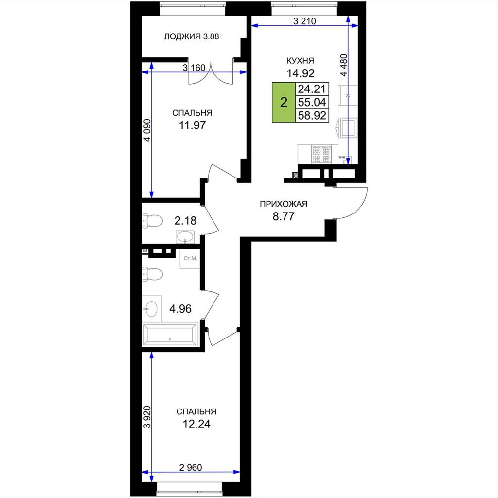 общая 58,92 м2, жилая 24,21 м2, кухни 14,92 м2 |