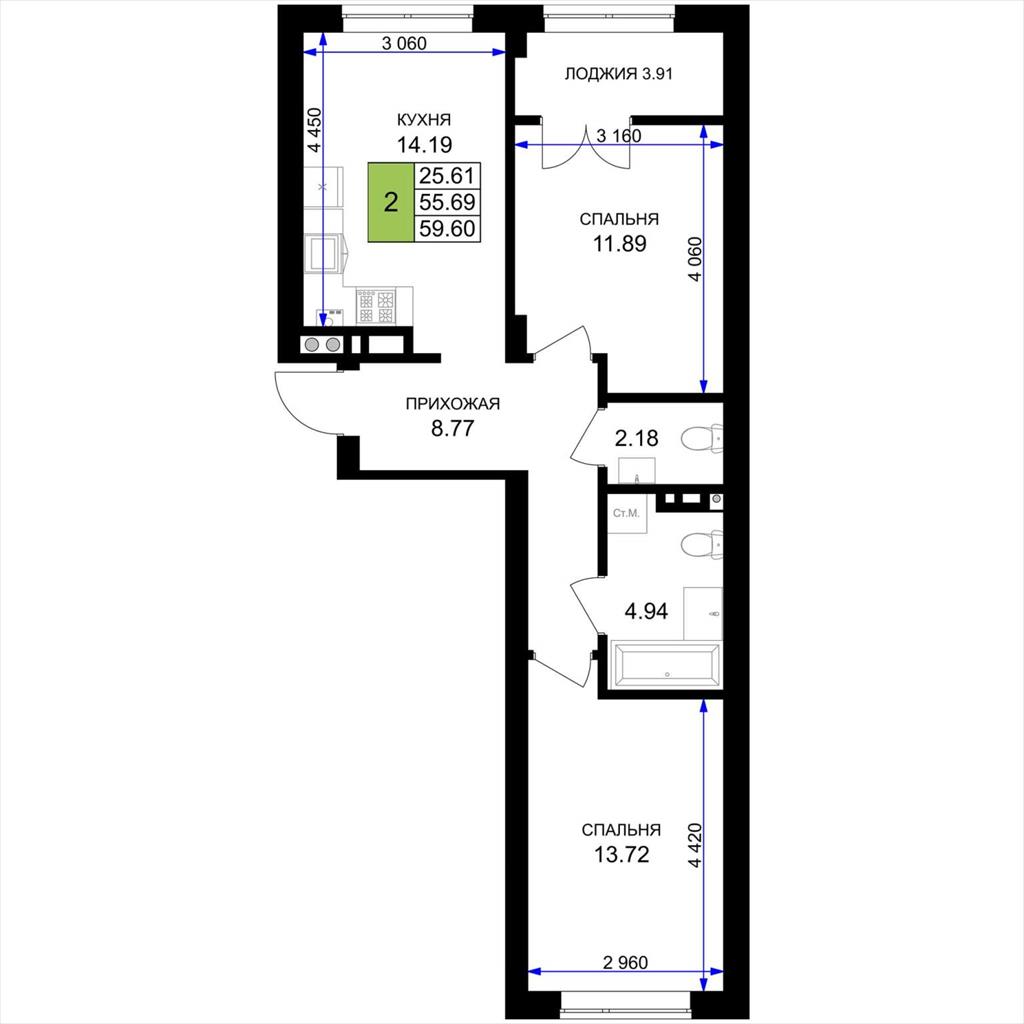 общая 59,6 м2, жилая 25,61 м2, кухни 14,19 м2 |