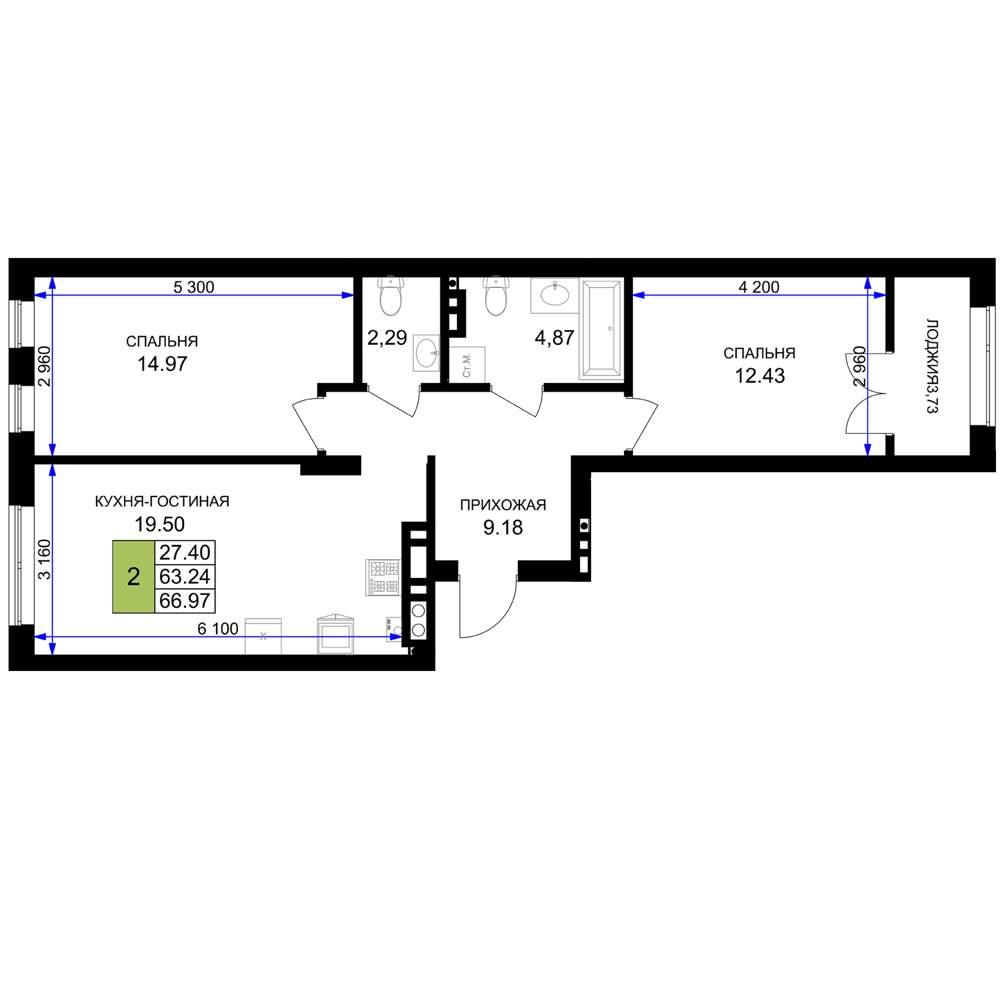 общая 66,97 м2, жилая 27,4 м2, кухни 19,5 м2 |