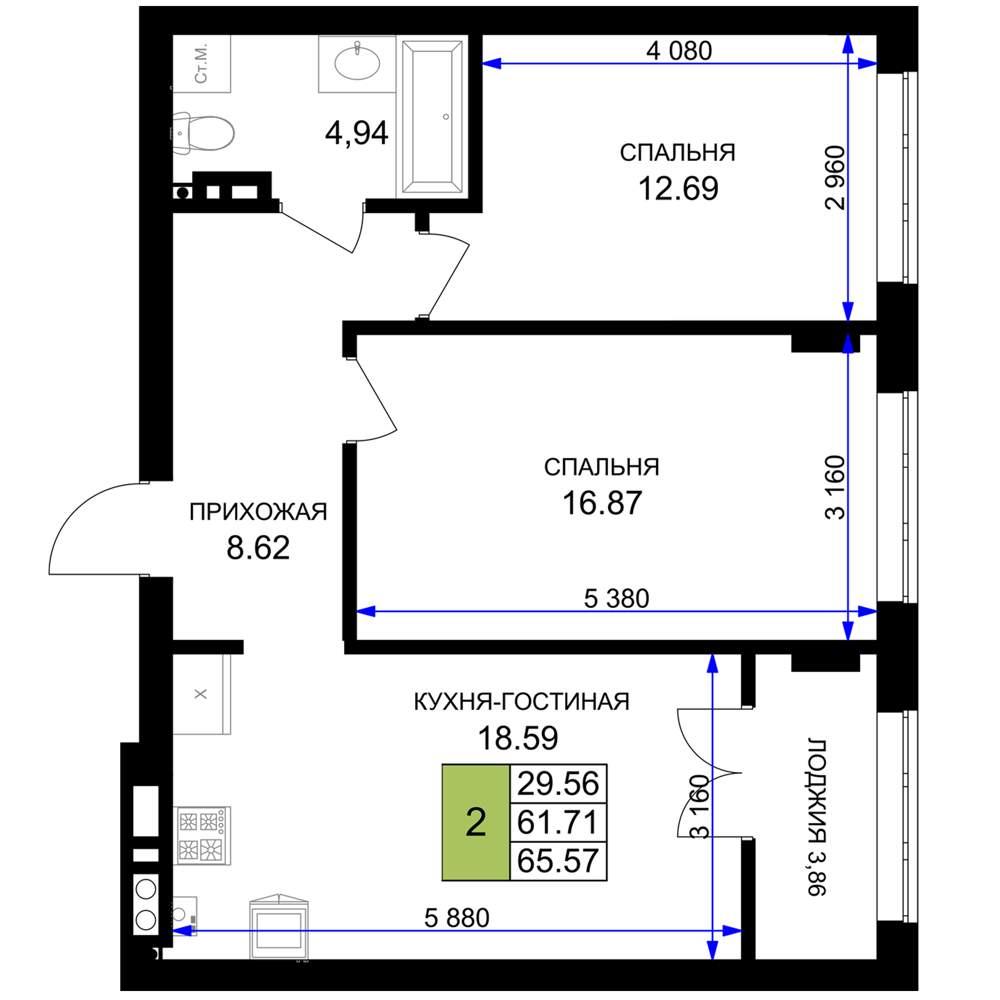 общая 65,57 м2, жилая 29,56 м2, кухни 18,59 м2 |