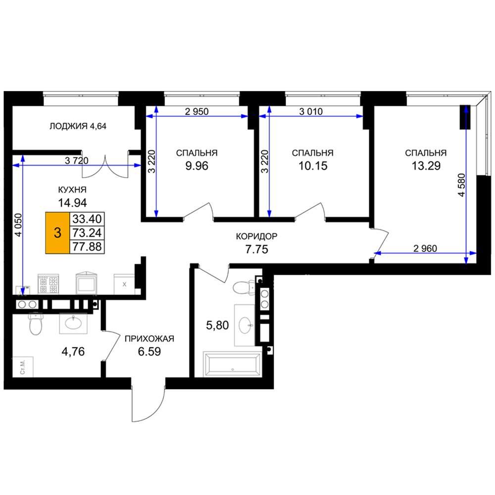 общая 77,88 м2, жилая 33,4 м2, кухни 14,94 м2 |