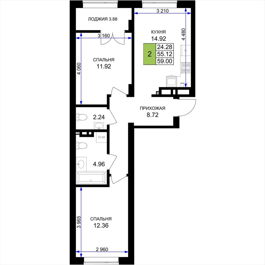 общая 59 м2, жилая 24,28 м2, кухни 14,92 м2 |