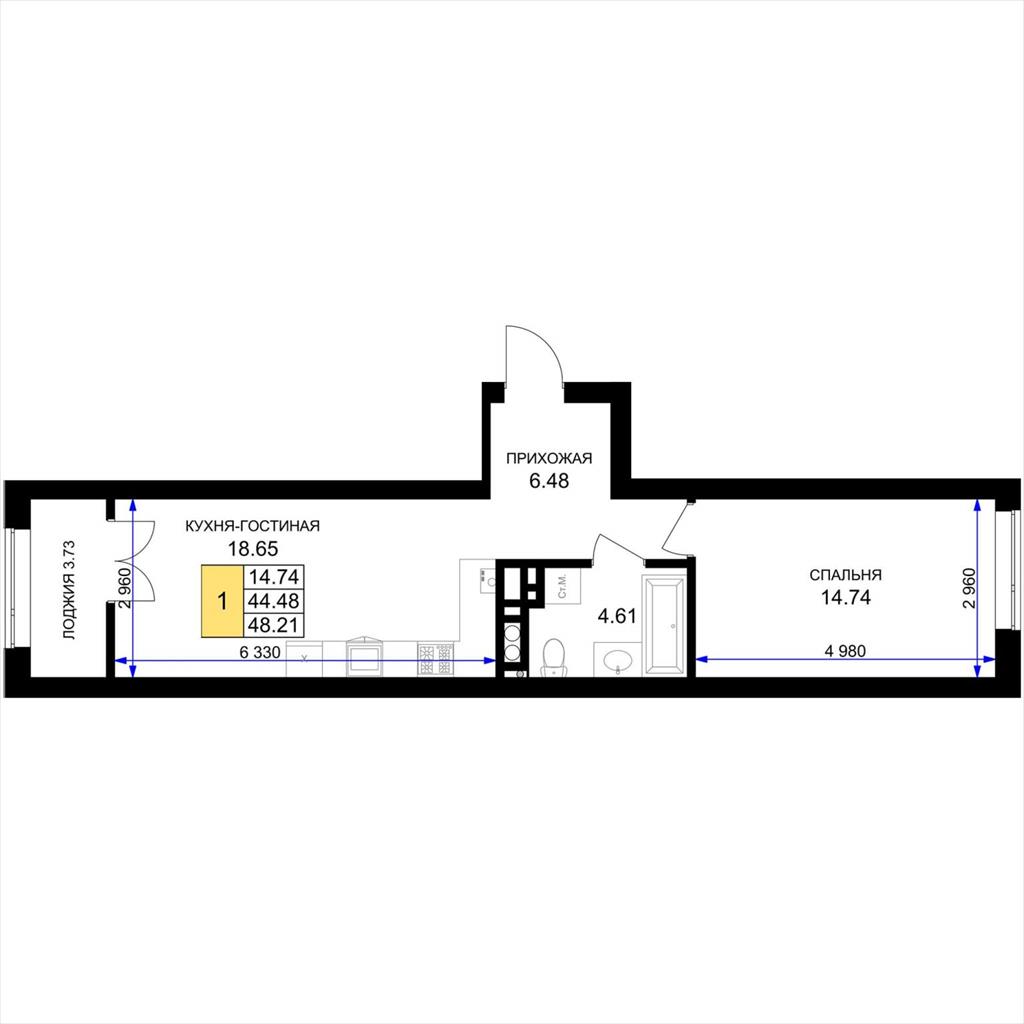 общая 48,21 м2, жилая 14,74 м2, кухни 18,65 м2 |