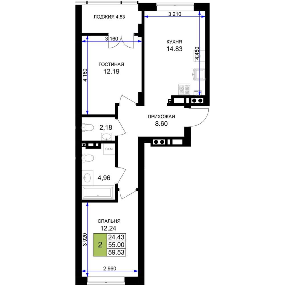 общая 59,53 м2, жилая 24,43 м2, кухни 14,83 м2 |