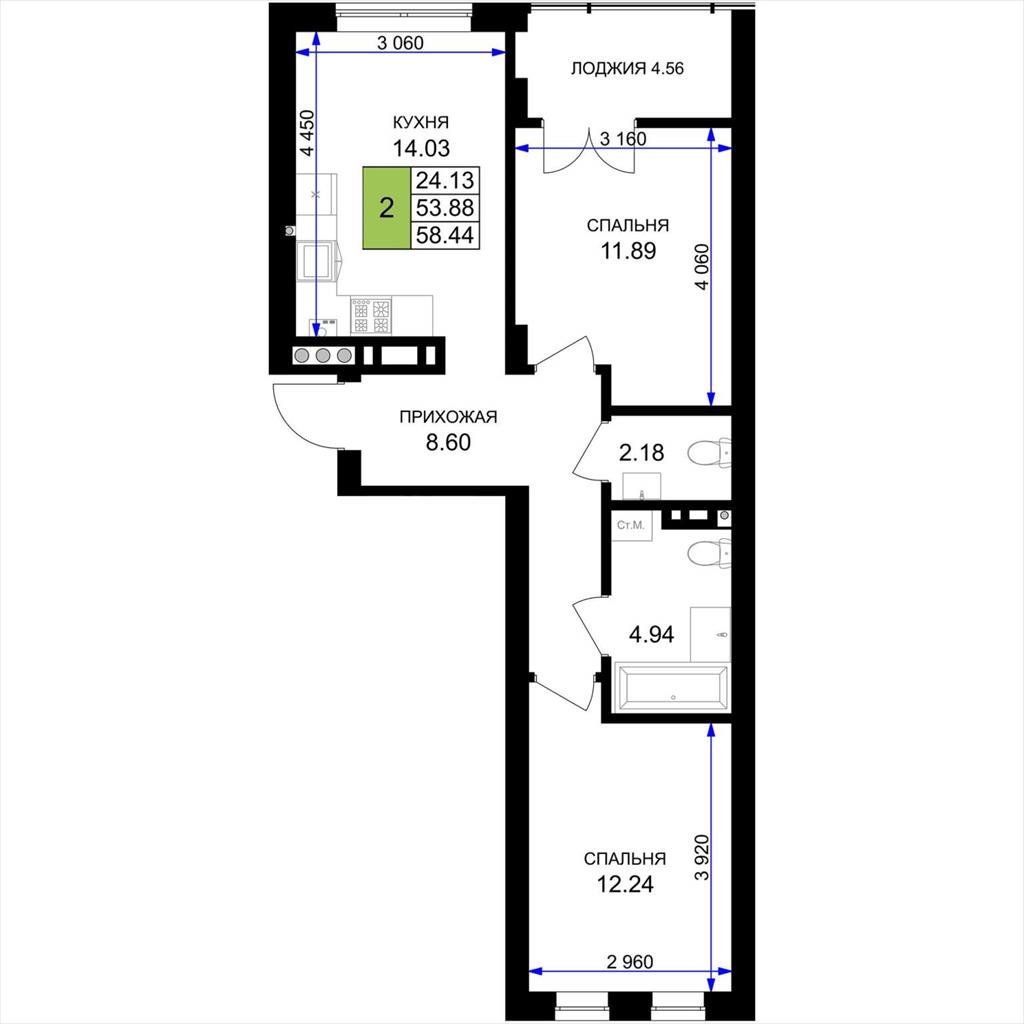 общая 58,44 м2, жилая 24,13 м2, кухни 14,03 м2 |