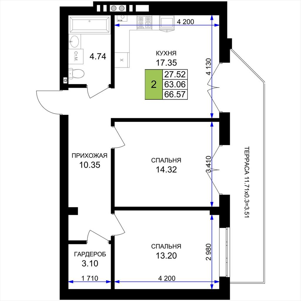 общая 66,57 м2, жилая 27,52 м2, кухни 17,35 м2 |