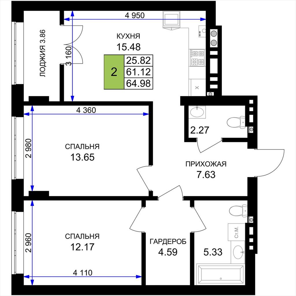 общая 64,98 м2, жилая 25,82 м2, кухни 15,48 м2 |
