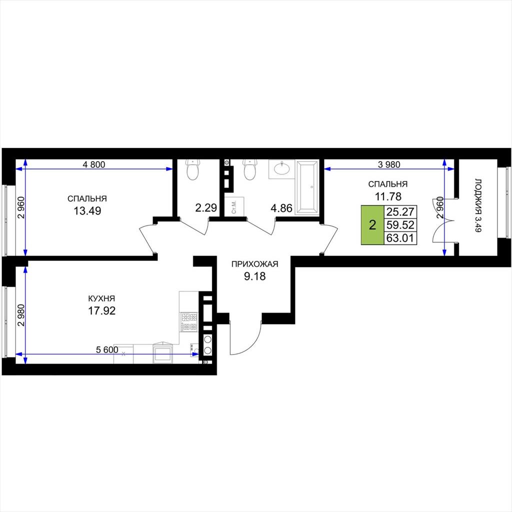 общая 63,01 м2, жилая 25,27 м2, кухни 17,92 м2 |