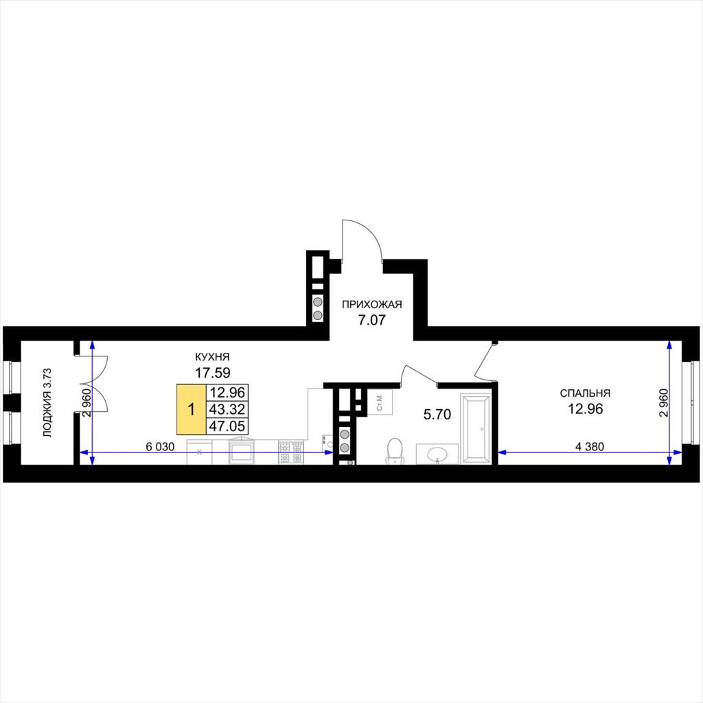 общая 47,05 м2, жилая 12,96 м2, кухни 17,59 м2 |
