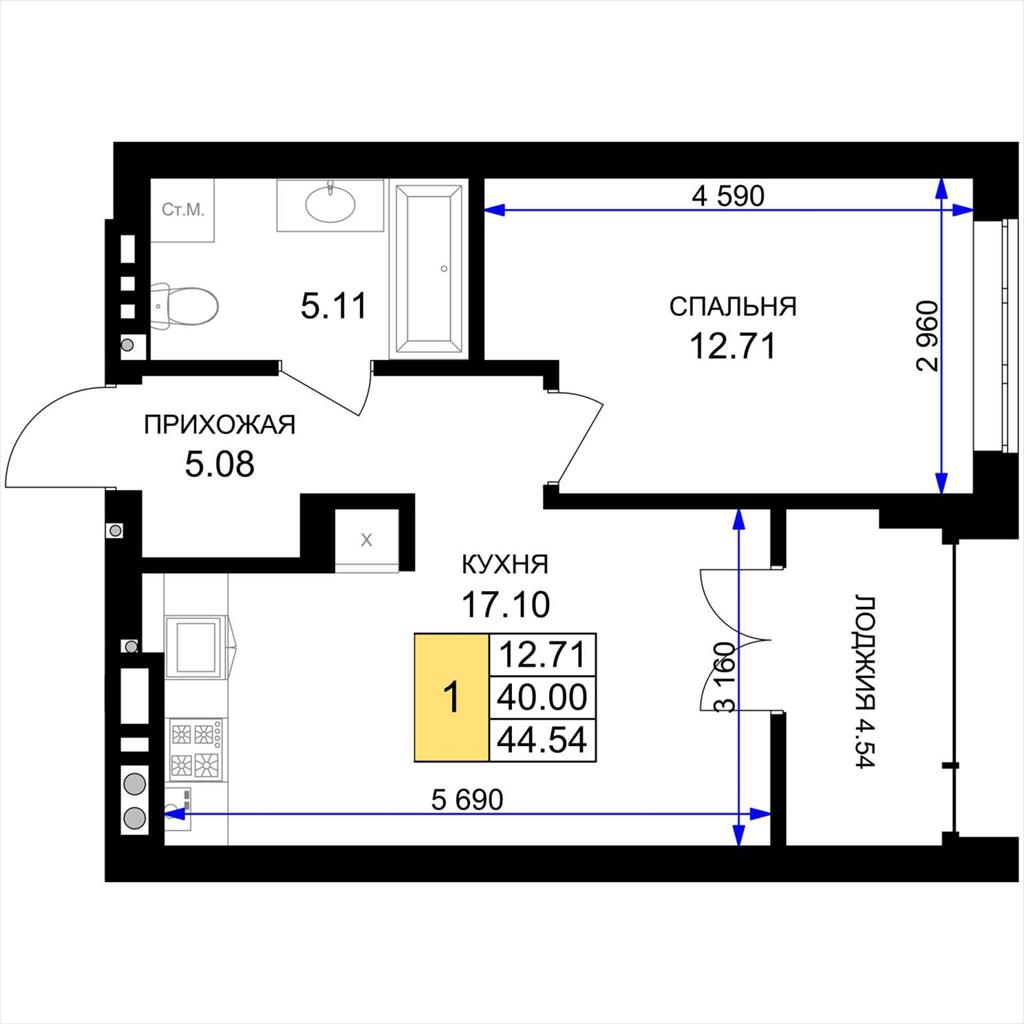 общая 44,54 м2, жилая 12,71 м2, кухни 17,1 м2 |