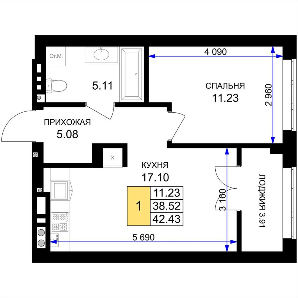 общая 42,43 м2, жилая 11,23 м2, кухни 17,1 м2 |