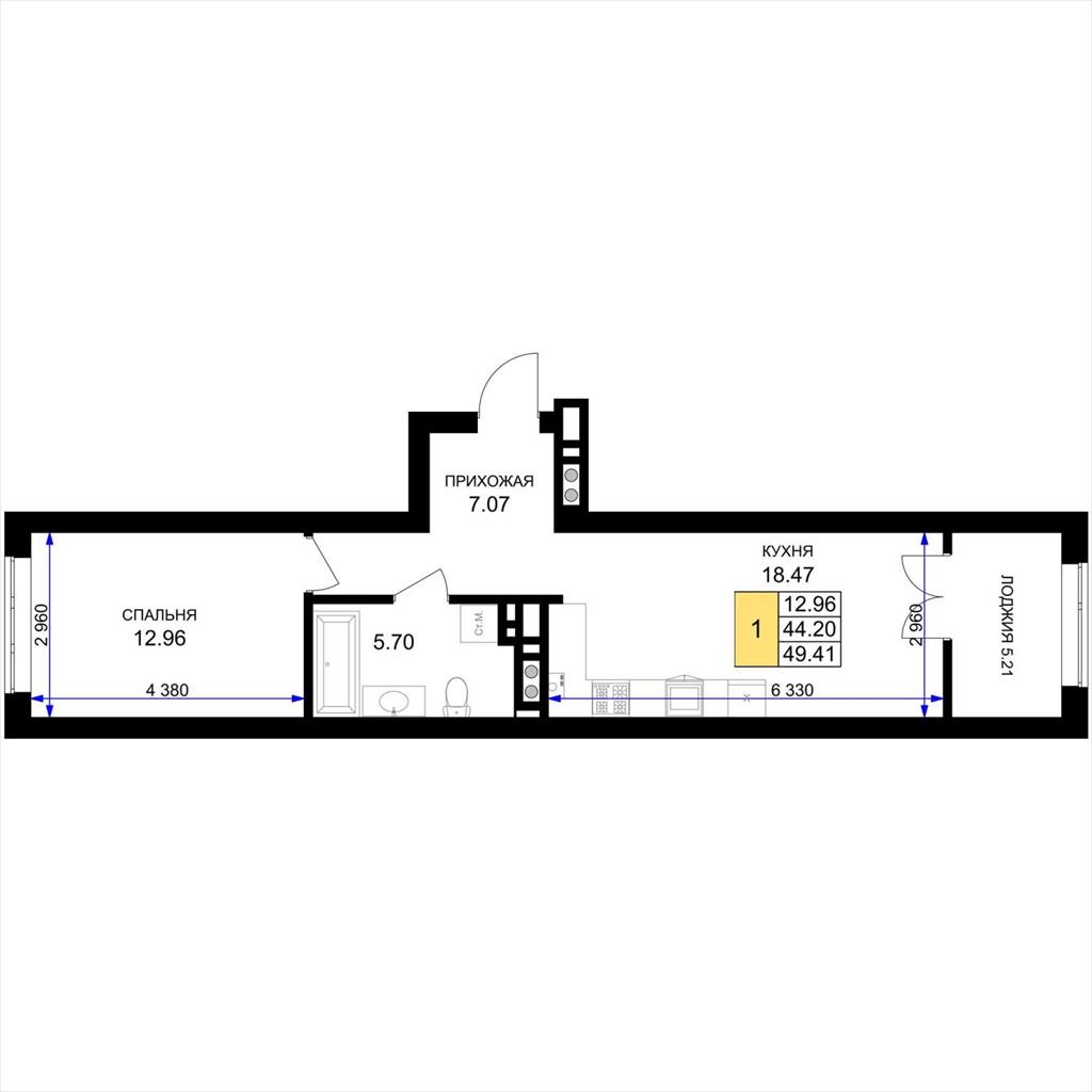 общая 49,41 м2, жилая 12,96 м2, кухни 18,47 м2 |