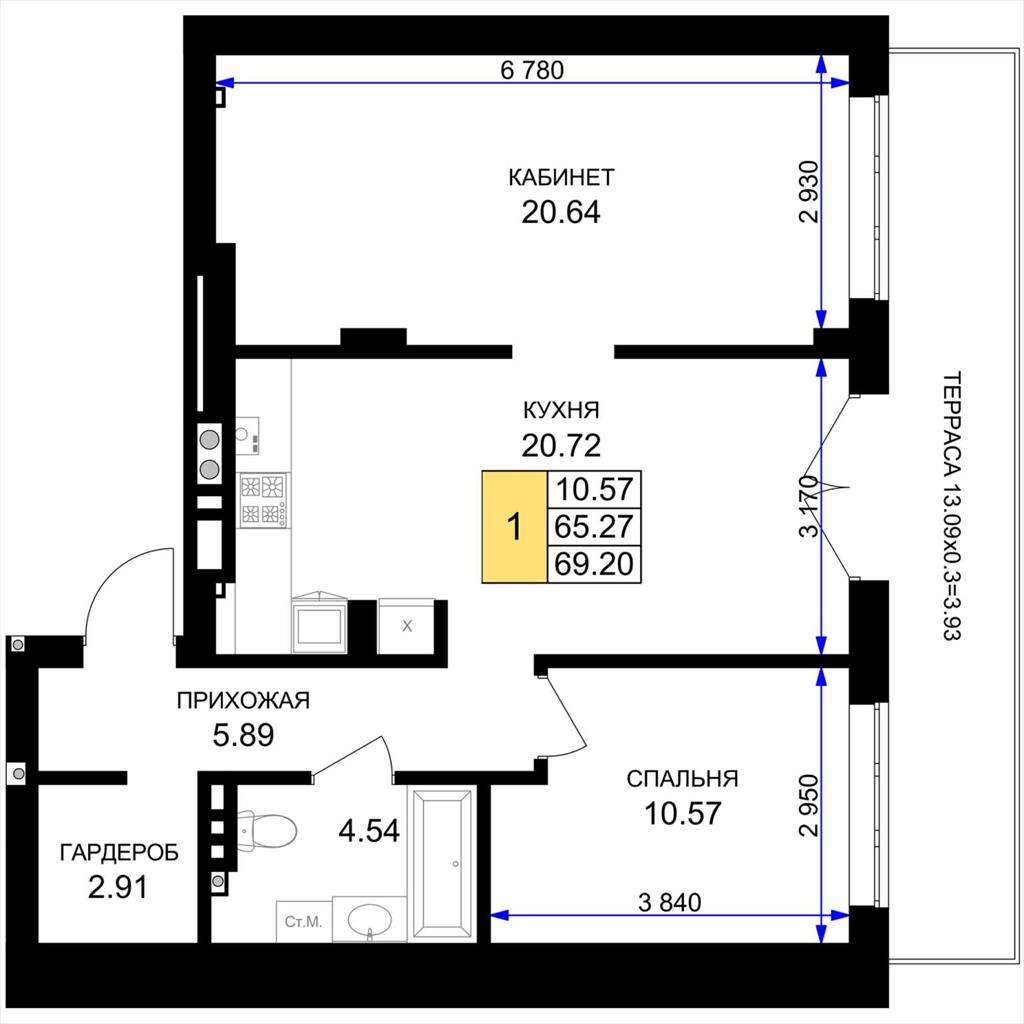 общая 69,2 м2, жилая 10,57 м2, кухни 20,72 м2 |