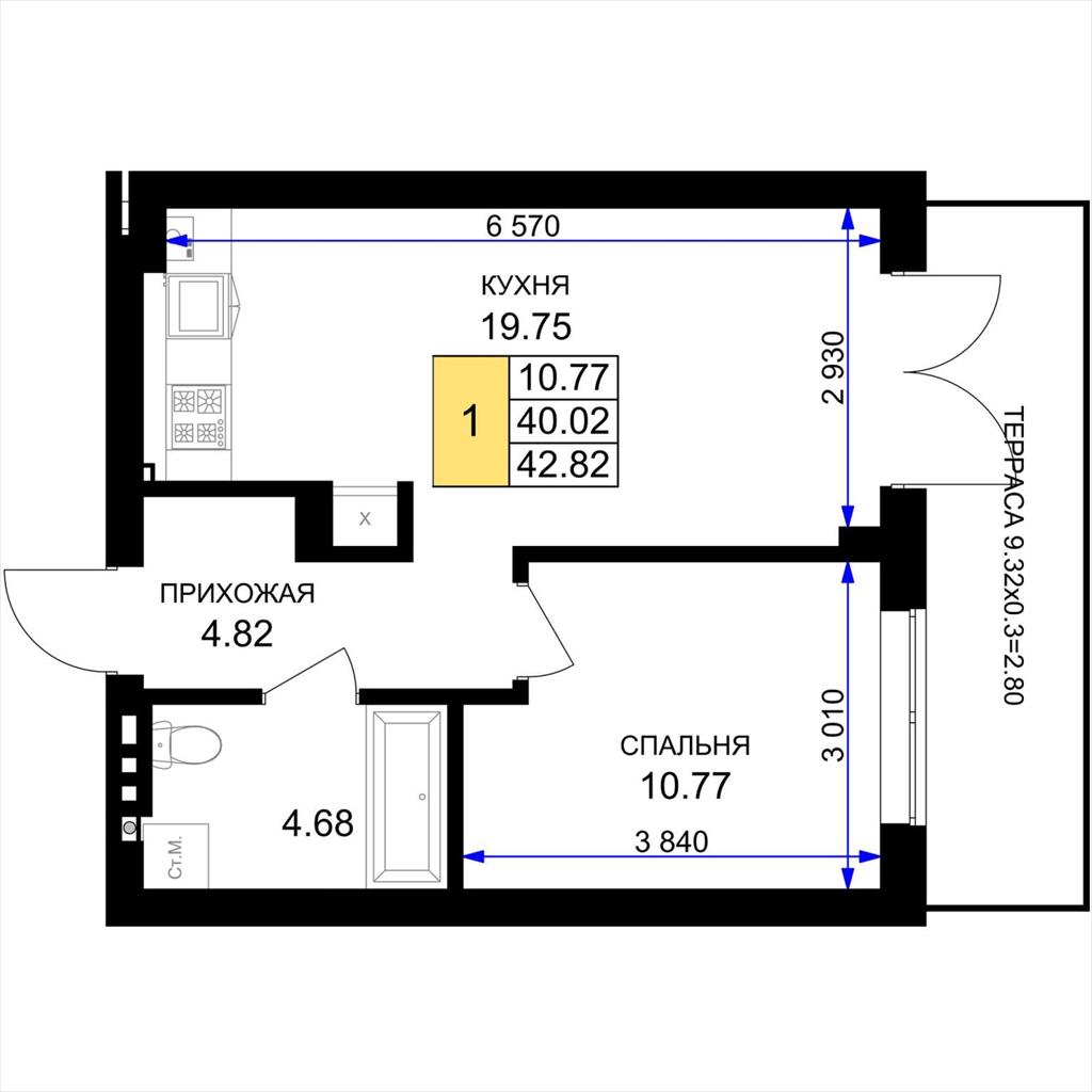 общая 42,82 м2, жилая 10,77 м2, кухни 19,75 м2 |