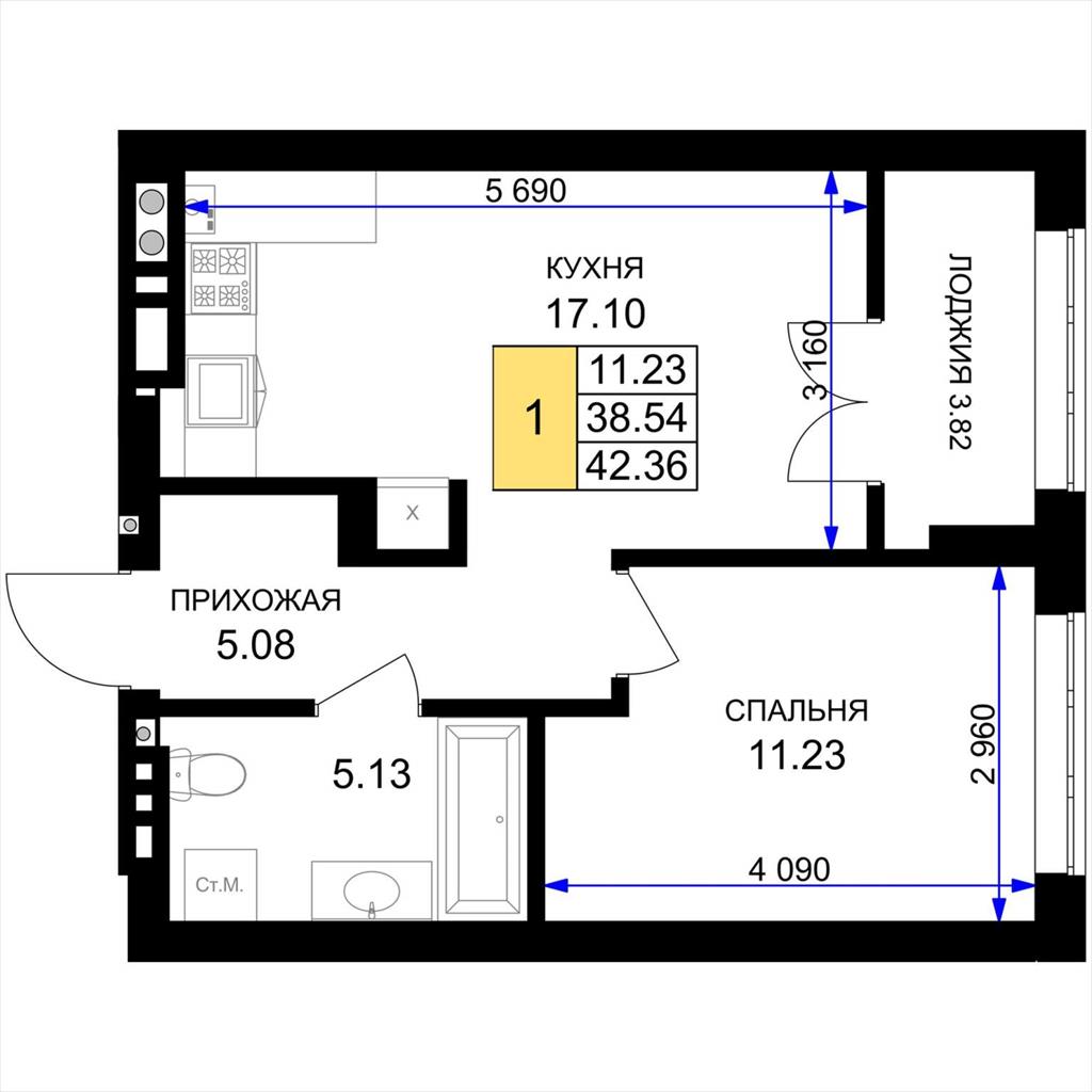 общая 42,36 м2, жилая 11,23 м2, кухни 17,1 м2 |