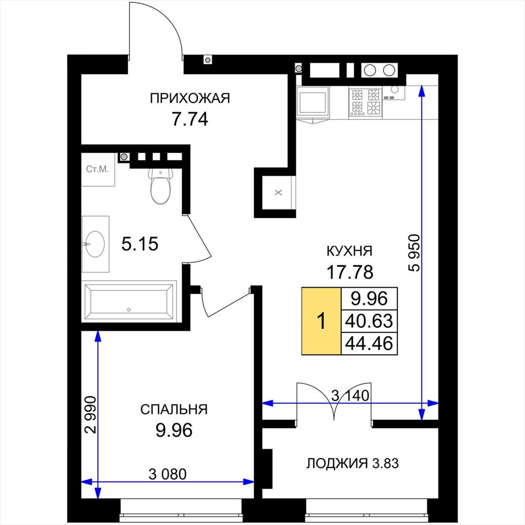 общая 44,46 м2, жилая 9,96 м2, кухни 17,78 м2 |