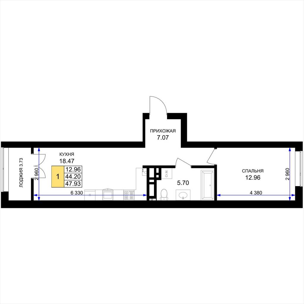 общая 47,93 м2, жилая 12,96 м2, кухни 18,47 м2 |